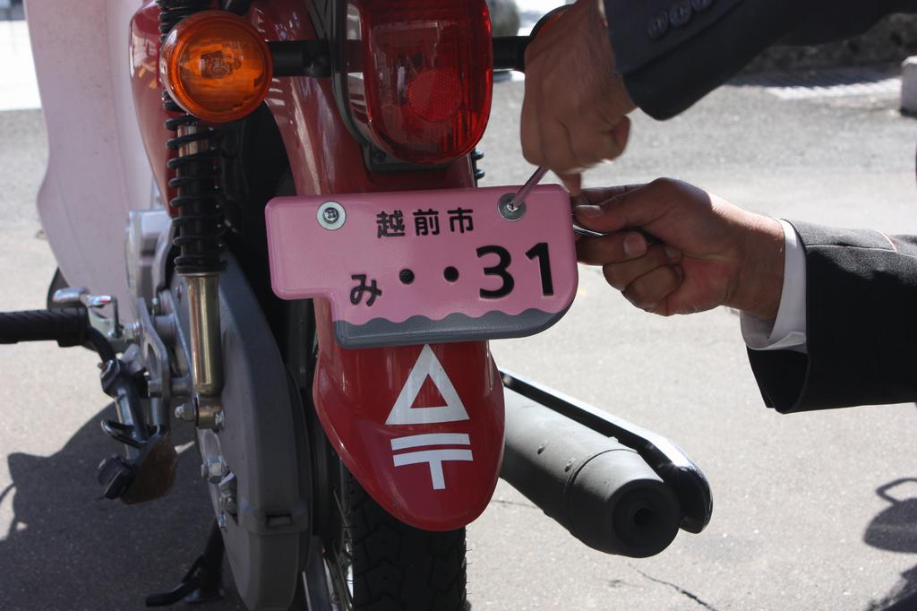 10月3日からは県内で初めて、125cc以下のバイクのナンバープレートに越前打刃物の包丁をモチーフにしたオリジナルデザインが決定し、交付されました。