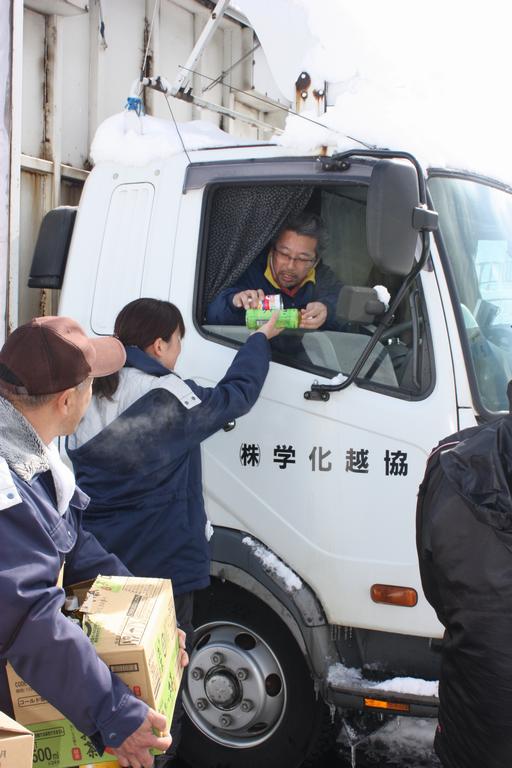 市内では、国道8号に多くの車が立ち往生したことから、運転手などに救援物資を配付しました。