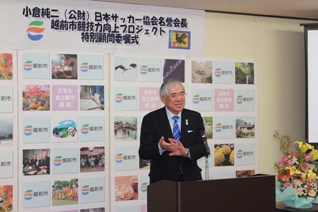 平成30年の「福井しあわせ元気国体」に向け、指導者や選手の競技力向上を図るため、日本サッカー協会名誉会長の小倉純二氏(越前市ふるさと大使)を特別顧問に迎え、4月に「越前市競技力向上プロジェクト」を開始しました。基本的プログラムの一環として、7月にフィジカルをテーマにサッカー日本代表チーム専属トレーナーの早川直樹氏を、11月には食をテーマに株式会社タニタの管理栄養士の小澤智子氏を招き、講習会を開催しました。
