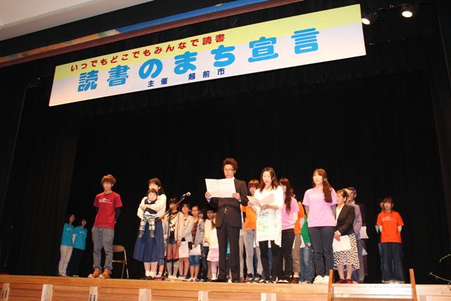 県内初の「読書のまち宣言」が3月議会で採択され、5月5日に「越前市ふるさと大使」のかこさとし氏を迎え、「読書のまち宣言式」を行いました。宣言では、「親子読み聞かせ」をはじめ「朝読書」「家読書」「地域読書」「生涯読書」に取り組むことをうたいました。