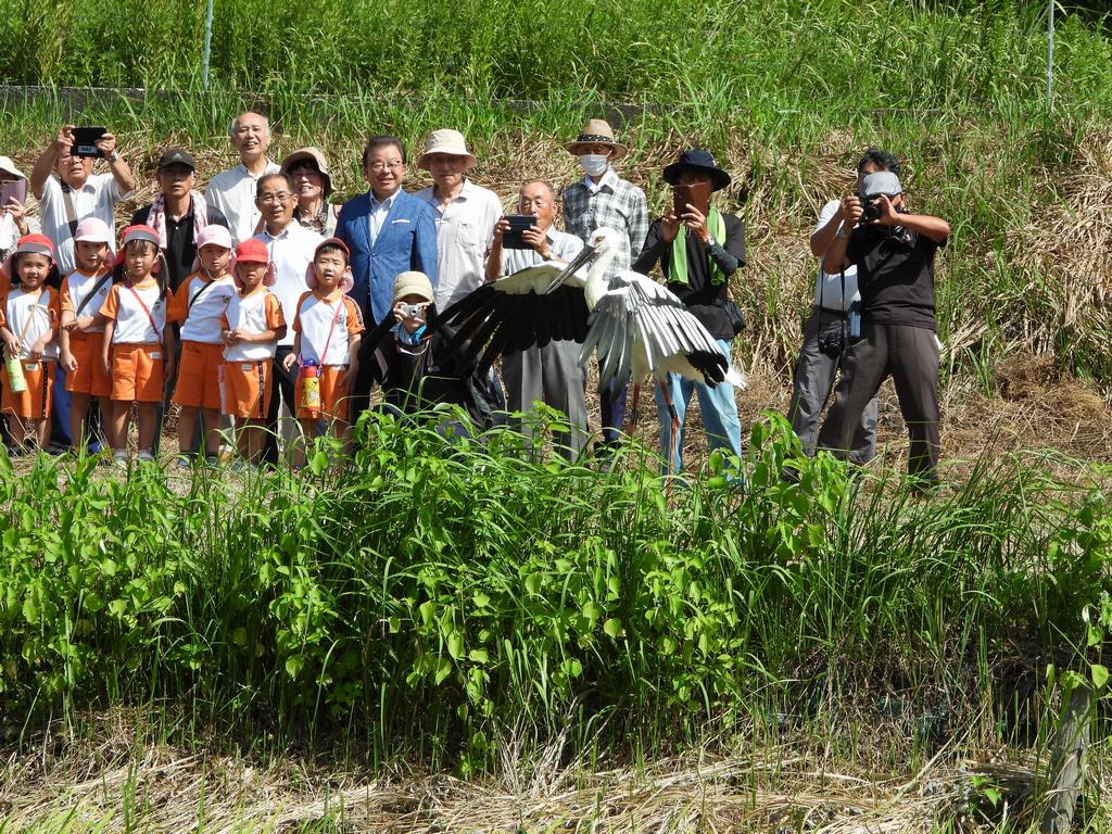 令和7年9月2日、強い夏の日差しの中で、越前市服間地区の「もやいの郷」で、地元の服間小学校の児童や認定こども園の園児、地域の方々やコウノトリに関わってこられた皆さんが見守る中で、コウノトリの放鳥が行われた。