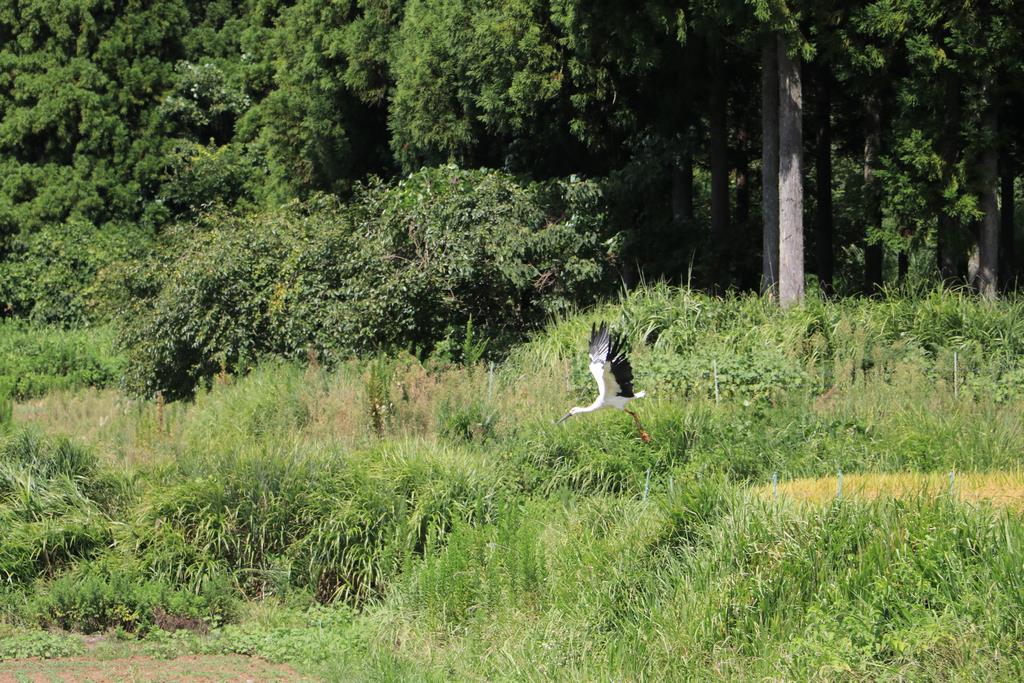 車を走らせているとコウノトリがまちなかを飛ぶ美しい姿を見かけた。有機の田んぼの稲刈りを見に行けば、4羽のコウノトリが作業中のコンバインの横で餌をくわえている。