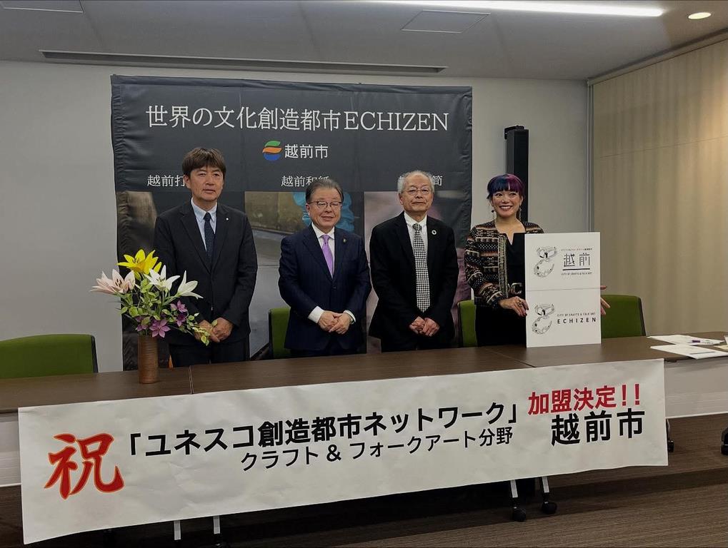創造都市ネットワークへの加盟は、宝物を活かすという越前市政の目標のひとつとして私が当初から掲げていたものである。総合計画にも、文化県都宣言プロジェクトとして位置付け、エンジンとなる創造都市推進会議や文化創造みらい会議を設け、伝統工芸団体、文化団体など多くの市民の皆様とともに進めてきた。越前和紙、越前打刃物、越前箪笥の3つの伝統工芸には、1500年以上前から、豊かな里山の自然によって育まれてきた歴史と文化が、今なお産業として息づいている。そして、今回の登録は、伝統工芸のみならず、今を生きる市民の生活の中で、音楽、文学、絵画、書道、歌や踊といったものが盛んに行われ、越前万歳や獅子返しなどの伝統が長年受け継がれていることも評価の対象となった。
