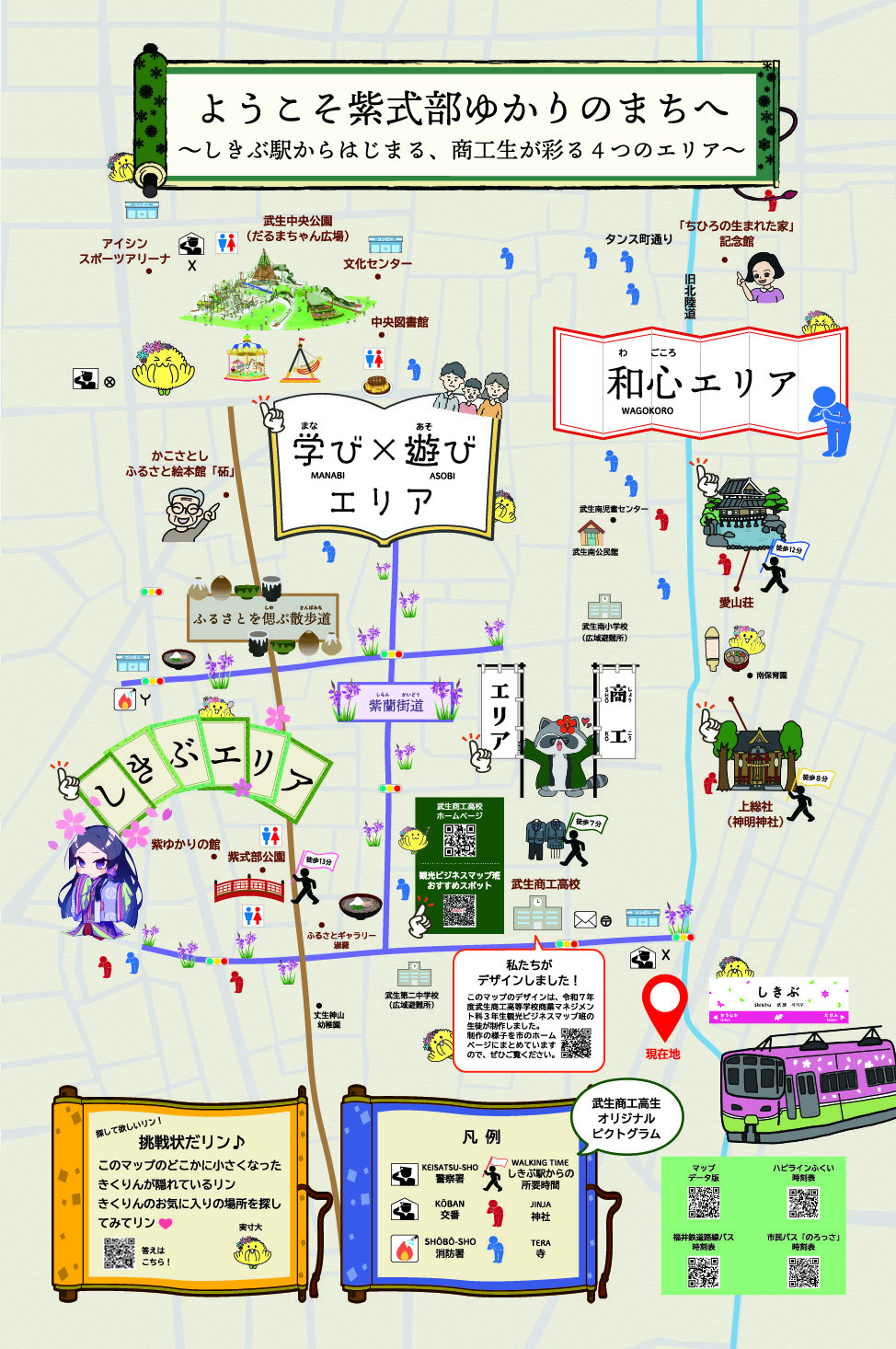 マップ内のイラストは、似顔絵やハピラインの電車も含めてほとんどを生徒が描きました。また、マップ内の「観光ビジネスマップ班おすすめスポット」のQRコードについても生徒が全て作成しました。QRコードは「しきぶ駅から行けるおすすめスポット」や「マップの見どころ」、「エリアの紹介」について掲載していますので、ぜひご覧ください!