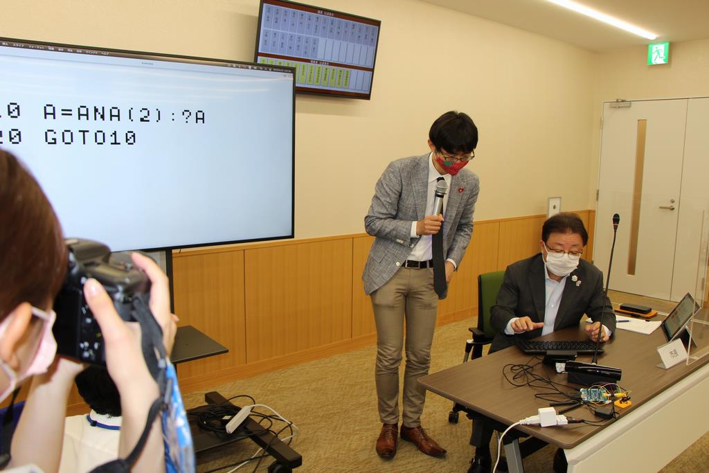 CDOである市長自らアドバイザーからプログラミングを習い、鳥獣が檻にかかると端末に通知が届くというコードを書き、実際にセンサーが反応し通知が届くことを体験しました。