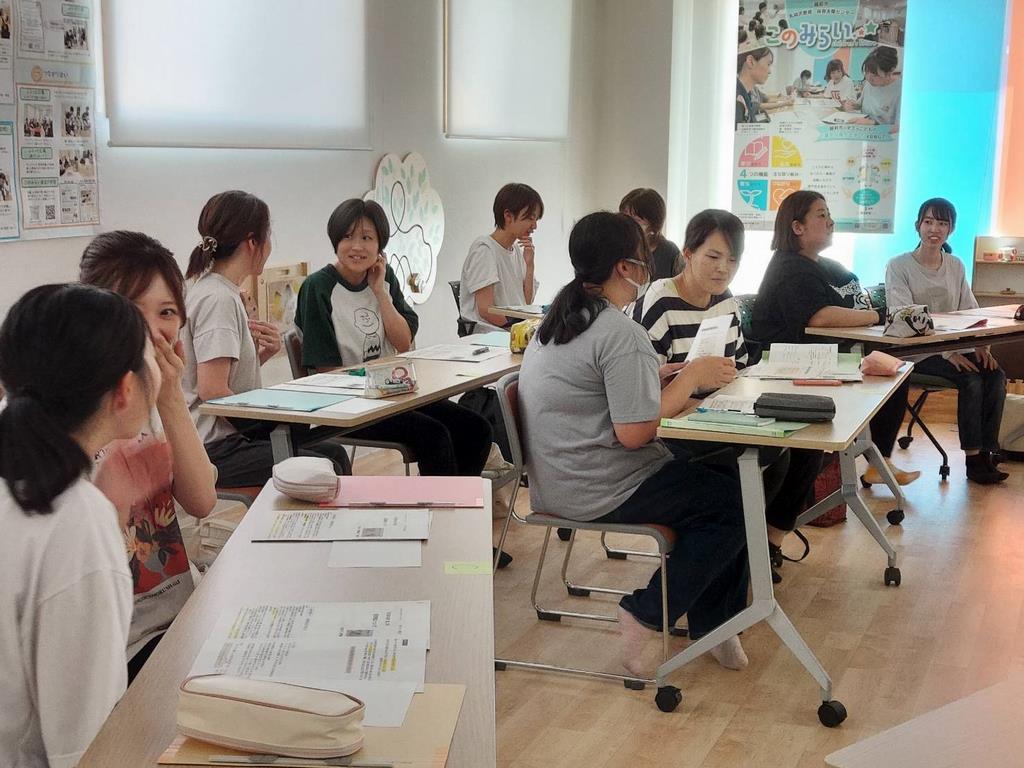 中堅保育者を対象に、園でのこども理解を深めていくための工夫や、事例を使ってロールプレイ演習を行いながら、ケース検討の意義や進め方を学びます。第1回目は、3グループに分かれて、各クラスや園において困っていることはなにか、各発達年齢のイメージはどのようなものか等について、グループワークを行いました。講師の津田先生が各グループを巡回してくださり、話し合いを深めました。