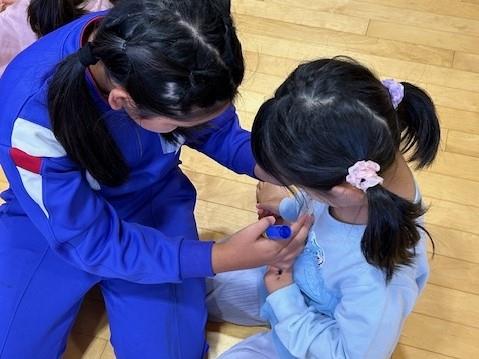 次は1年生が計画した遊びです。こども園の子が楽しいと思えるようにとみんなが知っている遊び「こおり鬼」「ドッジボール」「だるまさんが転んだ」を選んだとのこと。3年生に遊んでもらった時の経験を生かしてビブス(ゼッケン)でチーム分けをしました。ビブスを着けた5歳児は「園にないものがあった。着られてうれしい!」と誇らしげでした。