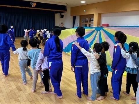 神山小学校の5年生が神山認定こども園の5歳児の下へ遊びに来ました。まずはふれあい遊びで心ほぐし。5年生がテープの名札を5歳児の胸に貼ったり好きなものインタビューをしたりしてすっかり仲良くなりました。全身を使ったパラバルーン遊びは大盛り上がりでした。「えっ!もう帰る時間?」「楽しかった!」「また遊びたいね」「また来るね」と別れを惜しんでいる様子でした。次の交流が楽しみですね!