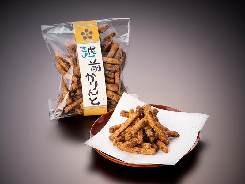 刻んだ大豆を生地に練り込んで揚げ、黒糖をまぶしこんで仕上げる手作りのかりんとうです。大豆の香ばしさとポリポリとした食感、照りをつけずに仕上げるため、黒糖の優しい甘さとふんわりとした風味を楽しんでいただけます。使用する大豆は福井県産(主に越前市「里のほほえみ」)黒糖は鹿児島県産に限定しています。季節商品として越前市味真野地区の味真野茶、今立のごぼう、生姜を使った、新茶かりんとう、ごぼうかりんとう、生姜かりんとうも販売します。