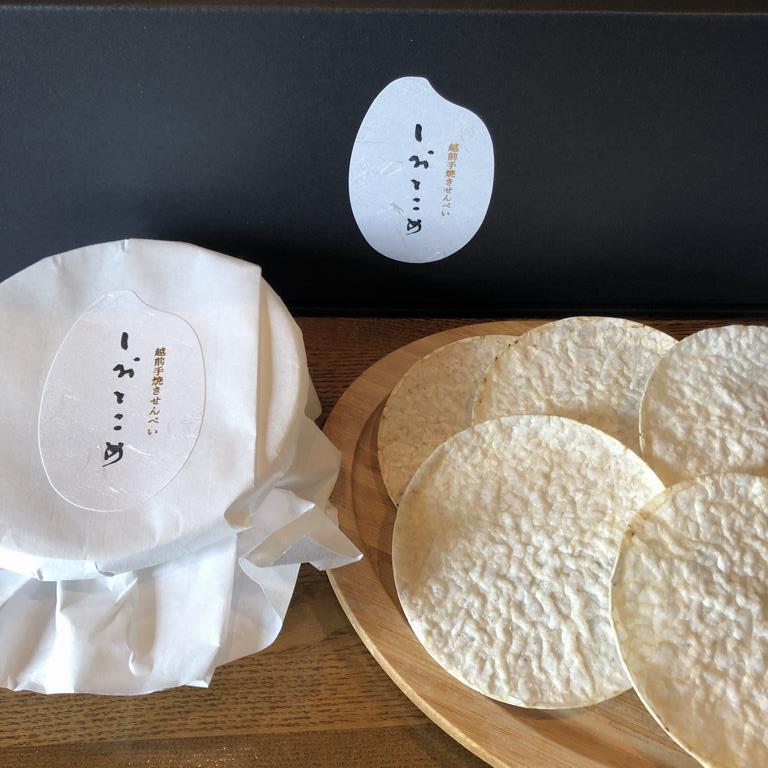 コウノトリがいる、坂口、白山地区のこだわった米と、越前海岸の海水だけで作る自然塩だけを使った、新感覚でありながら、どこか懐かしい米菓です。