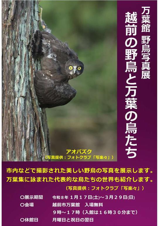 万葉館で野鳥写真展「越前の野鳥と万葉の鳥たち」を開催します