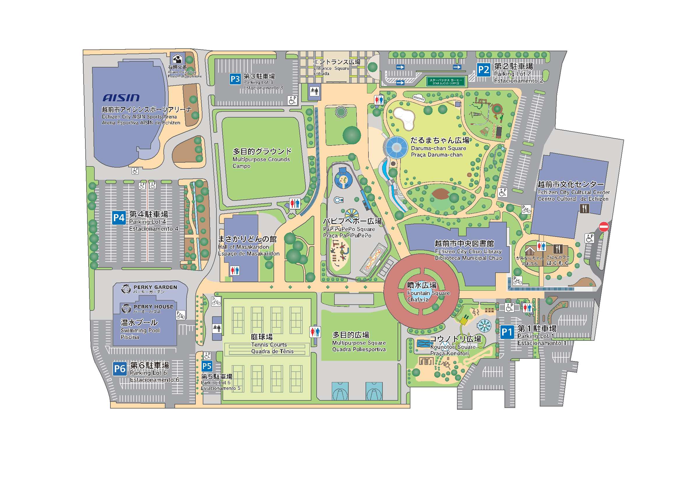 武生中央公園再整備は、基本コンセプト「老若男女が憩う・遊ぶ・見る・学ぶ・楽しむことのできる空間の形成」を基に、日本を代表する絵本作家かこさとし氏の監修をいただき整備しました。また、武生中央公園の市民の広場等の呼称については、本市出身の絵本作家・かこさとし氏にご相談の上、市民の広場の呼称を「だるまちゃん広場」に、モノレールの一帯を「パピプペポー広場」に、シンボル遊具の一帯を「コウノトリ広場」にしました。
