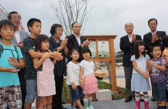 式典では、絵本作家かこさとし氏の作品の絵を使った、紙芝居舞台型の看板の除幕と、風船飛ばしを行いました。