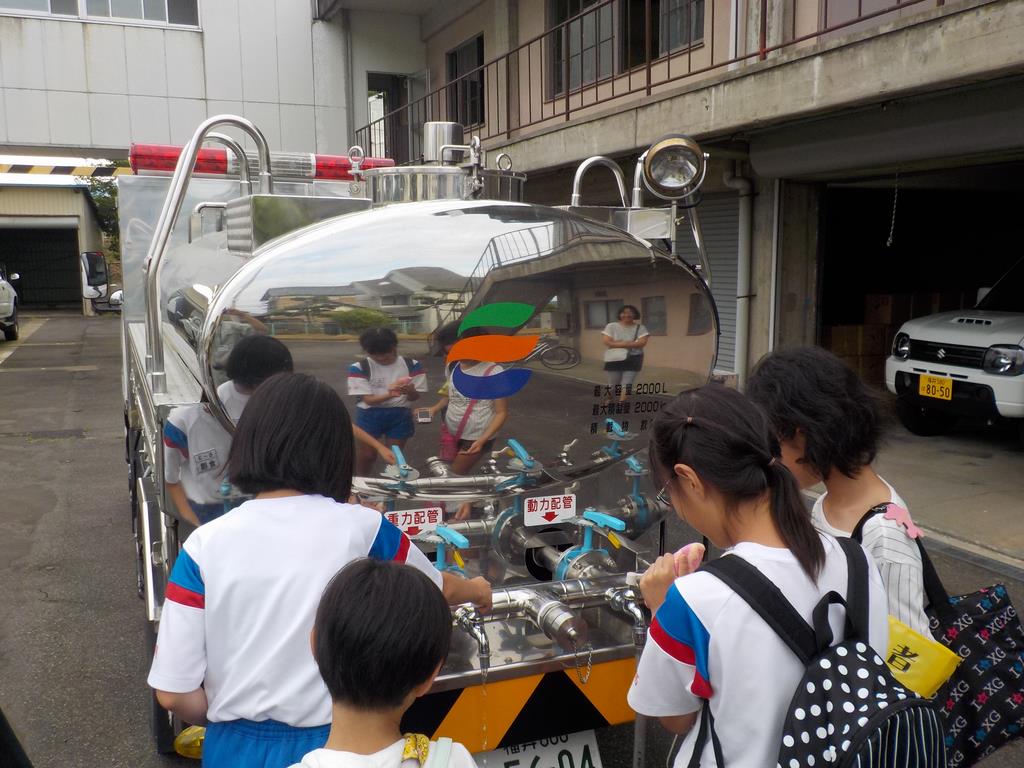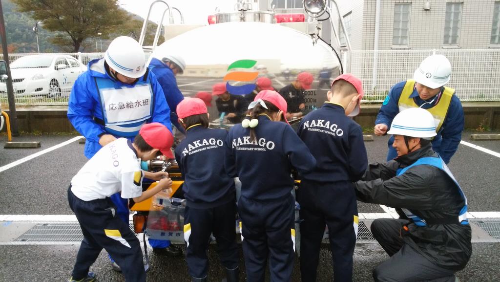 災害時を想定しての給水車による児童の給水体験の状況