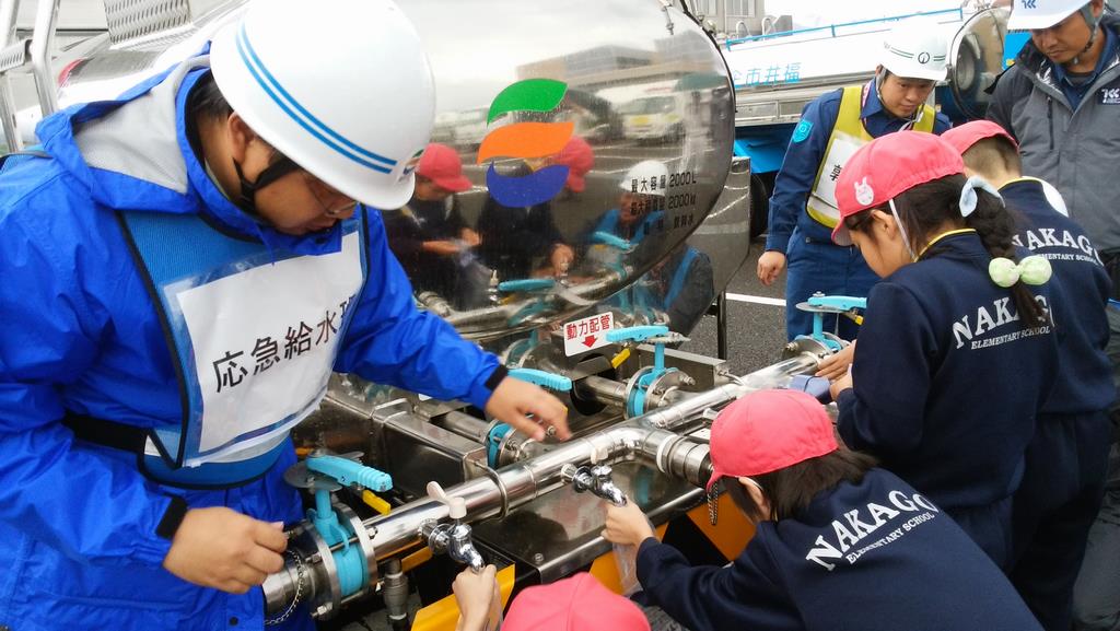災害時を想定しての給水車による児童の給水体験の状況