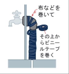 冷え込んだ朝などは、メーターや水道管が凍り、水が出ない場合があります。専用の保温材(または布など)を巻くなど凍結防止に努めましょう。水が出ない場合には応急処置として、メーターや水道管に布などをあて、ぬるま湯をかけて温めてください。※熱湯をかけると水道管が破裂する場合がありますのでご注意ください。