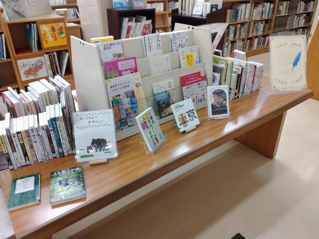 11月からの展示・特集です。「郷土の作家」や「文具の日」、「勤労感謝の日」、「犬の日」をテーマにして本を集めました。