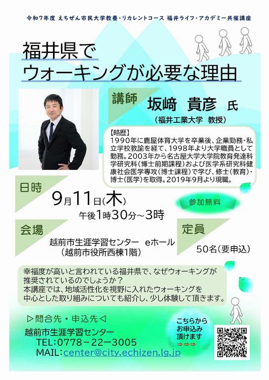 えちぜん市民大学「福井県でウォーキングが必要な理由」を開催します。