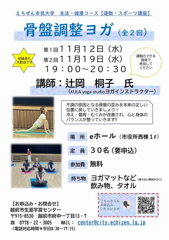 運動・スポーツ講座「骨盤調整ヨガ(全2回)」を開催します。(11月12日・19日)