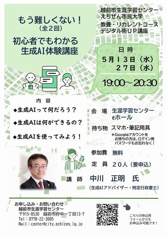 えちぜん市民大学「もう難しくない!初心者でもわかる生成AI体験講座」を開催します!