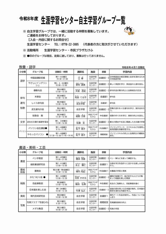 最終更新日 2026年4月2日 情報発信元 生涯学習センター 生涯学習センター 自主学習グループ PAGE-ID:899 令和8年度自主学習グループ 現在、23種類のジャンルで43団体が自主学習グループとして学習活動を行っています。 各自主学習グループでは、一緒に活動する仲間を募集しています。 (※一部のグループは、定員に達しており、募集は行なっておりません。詳細は一覧表をご確認ください。) ご連絡をお待ちしております。 入会・内容に関するお問合せ:越前市生涯学習センター(電話:0778-22-3005) 令和8年度自主学習グループ一覧表はこちら↓ ※令和8年4月1日現在 添付ファイル ★令和8年度自主学習グループ一覧(PDF形式 468キロバイト) 閲覧ソフト Acrobat Reader DC 印刷